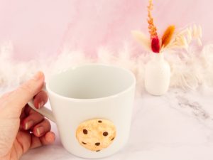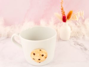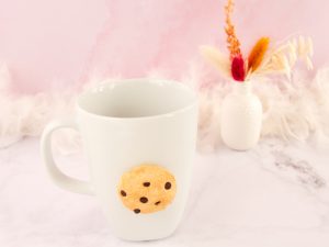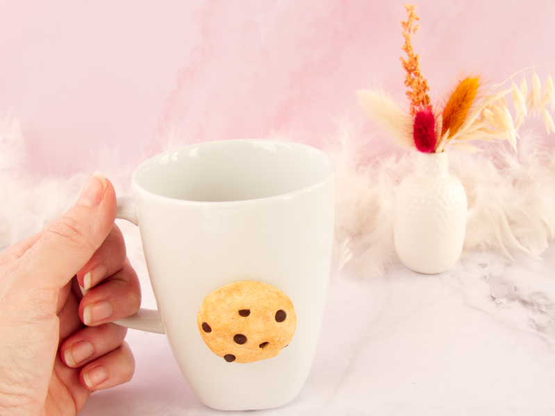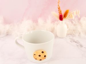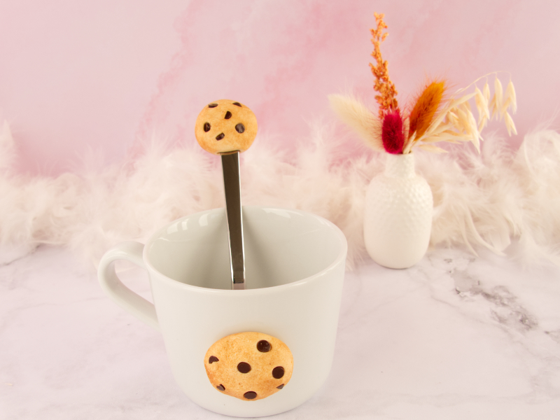 Un mug décoré avec un cookies plus vrai que nature. Modelé à la main dans mon atelier à la Ciotat. Cuillère cookie assortie disponible.