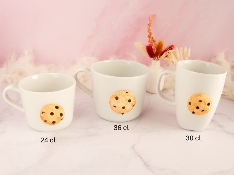 Ce Mug cookie est disponible en  trois tailles différentes : 24 cl, 30 cl et 36 cl afin que vous puissiez l’adapter à votre quotidien. Que vous préfériez une dose rapide de café ou une tasse généreuse de thé, nous avons la taille parfaite pour vous accompagner dans tous vos moments de détente.